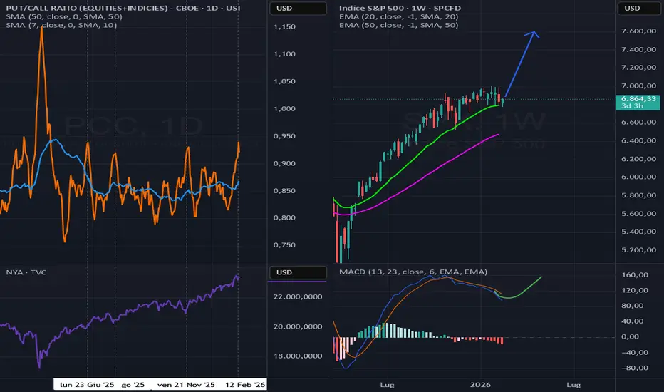a sinistra la put call ratio ha toccato livelli che, considerando il periodo da aprile 2025, hanno indicato minimi crescenti relativi e ripartenza.