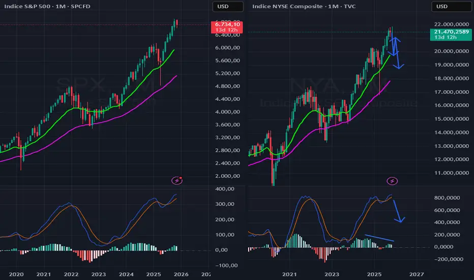 La divergenza mensile indica un top significativo ( essendo mensile ) degli indici. Il ribasso potrebbe essere anche piu profondo o duraturo nel tempo. Il macd sul nyse deve calare almeno a 400 dagli 800 attuali e li si vedrà il prezzo e quanto tempo ci vorrà.