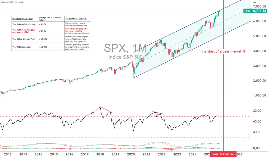 Da questa prospettiva, il 2026 rappresenterà il secondo anno del ciclo presidenziale di Donald Trump — tradizionalmente il più fragile per i mercati azionari. Dal punto di vista tecnico, l’S&P 500 ha recentemente raggiunto importanti zone di resistenza vicine ai massimi storici, dopo un notevole rally post-elettorale. Diversi indicatori di momentum mostrano un indebolimento della dinamica rialzista, mentre il rapporto prezzo/utili di Shiller si trova su livelli storicamente elevati, indicando valutazioni già eccessive.