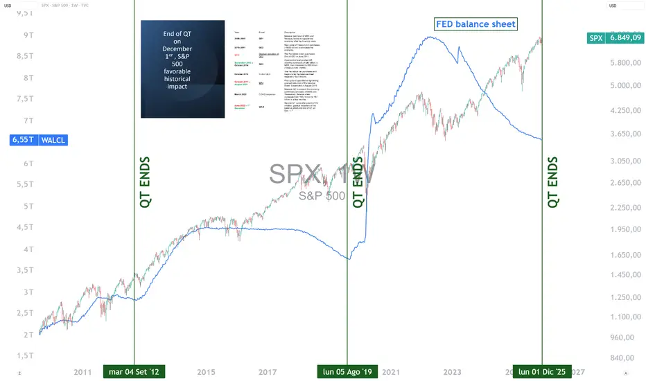La Federal Reserve statunitense (Fed) dovrebbe porre fine al suo programma di quantitative tightening (QT) il 1° dicembre 2025. Questo passaggio segna l’interruzione della riduzione del suo bilancio, dopo anni dedicati a ritirare liquidità dal sistema finanziario per combattere l’inflazione post-COVID. Storicamente, la fine di un ciclo di QT ha spesso coinciso con un miglioramento della tendenza dell’S&P 500. Tuttavia, pur essendo un segnale piuttosto favorevole, merita un’analisi sfumata, in un contesto in cui l’indice si trova già a livelli di valutazione storicamente elevati.