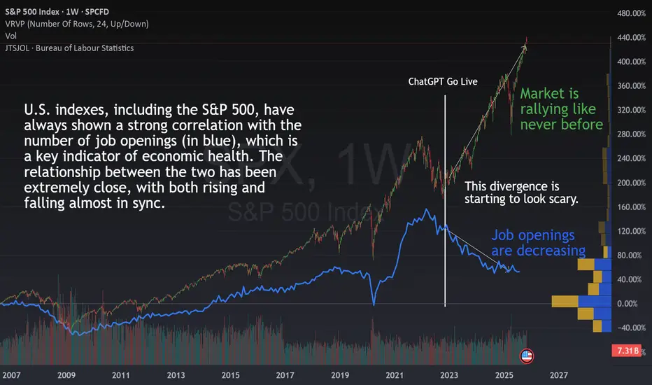 While job openings have kept declining steadily, the market has rallied like never before. This is not logical from a historical point of view.