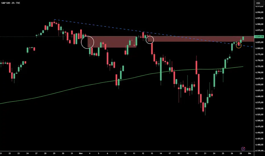 Nel corso del mese l’indice aveva già chiuso un primo gap down, quello lasciato aperto il 4 novembre, evidenziato sul grafico con il cerchio bianco di sinistra. In quell’occasione, una volta colmato il vuoto di prezzo, lo S&P 500 aveva avviato una fase di ritracciamento durata alcuni giorni, segno che l’area di gap aveva funzionato come zona di presa di profitto per il mercato.