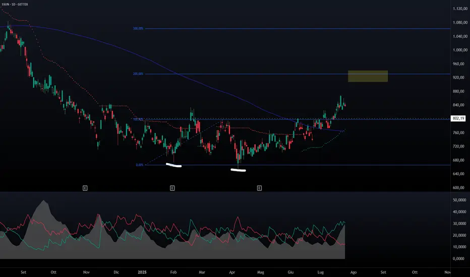 Interessante configurazione rialzista per il titolo Samsung dopo la violazione al rialzo di un'ampia figura di accumulazione e di un doppio minimo il primo obiettivo è la proiezione verso l'alto dell'area di accumulazione con target 930 stop 802.