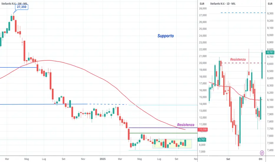 Sul grafico weekly si può osservare nota come STLAM sia scesa dal massimo storico di marzo 2024 a 27,35€, fino a toccare un minimo ad aprile 2025 a 7,26€, con un ribasso complessivo del 73% in tredici mesi. Inotlre è evidneziato come da giugno scambia all’interno di un’area di congestione, con resistenza chiave a 8,85€.