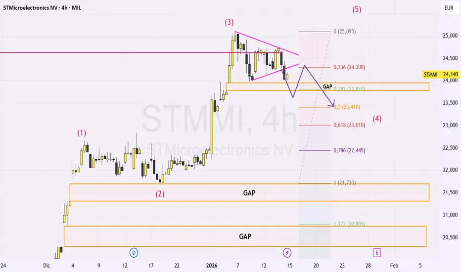 Sul 4H il quadro è ancora più leggibile: il movimento precedente appare riconducibile a una struttura impulsiva rialzista in 5 onde (Elliott). Al momento è plausibile l’ipotesi di trovarsi in onda 4 correttiva, con target in area 23,40 €, corrispondente al 50% di ritracciamento di onda 3.