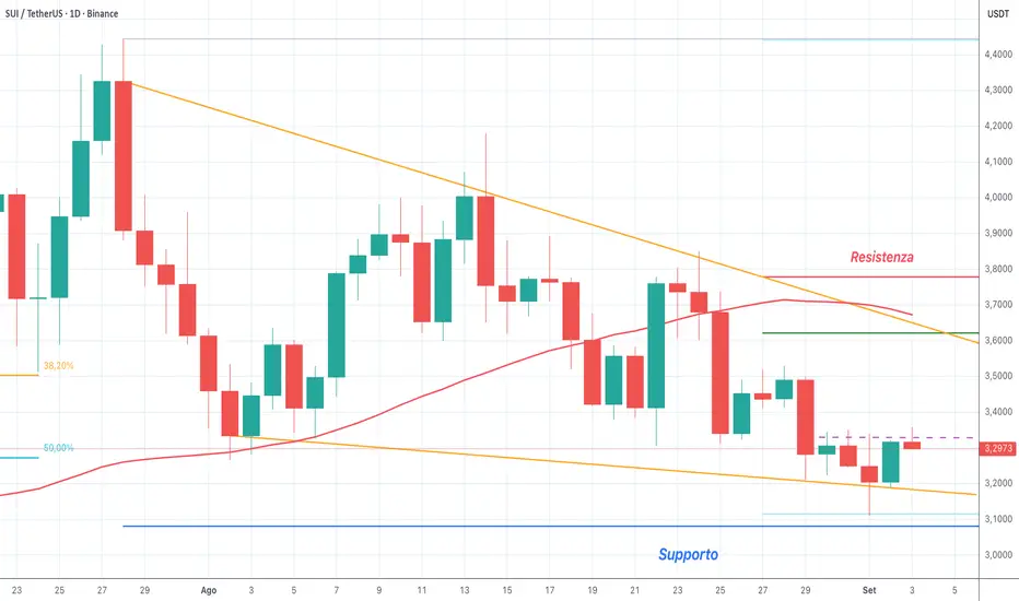 Andamento complesso per il prezzo di SUI da fine luglio, quando ha toccato un massimo di periodo a 4,4044 USDT. Dal grafico si nota una fase di ribasso caratterizzata da una serie di massimi e minimi decrescenti, che hanno portato due giorni fa il prezzo a sfiorare l’area di supporto compresa tra 3,00 e 3,05 USDT.