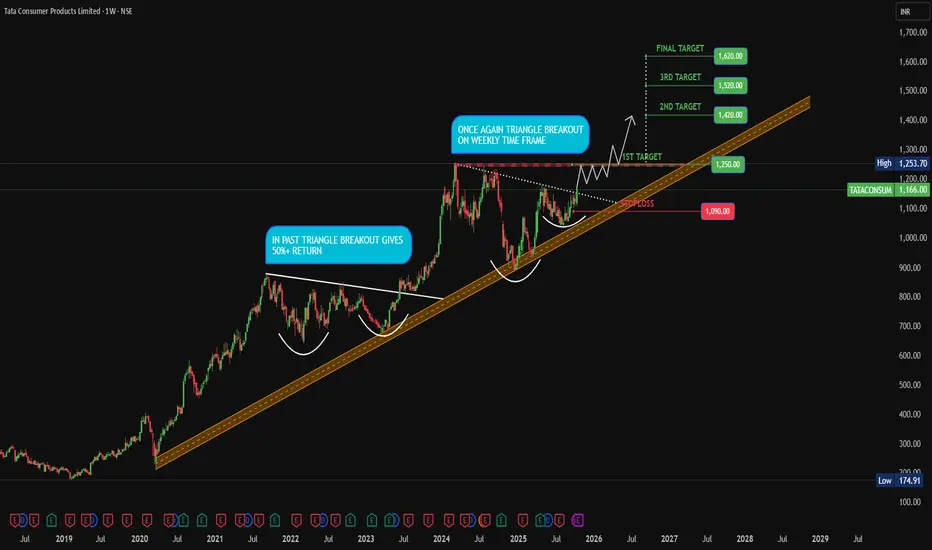in past TATA CONS stock make same triangle structure and gives a breakout than consolidated for 6 to 7 week for accumulation and than gives 52%++ return in a year. Last week its gives same breakout with strong support and good to consider for long term with good risk return. Do your own study and research before entering any position. No guarantee return.