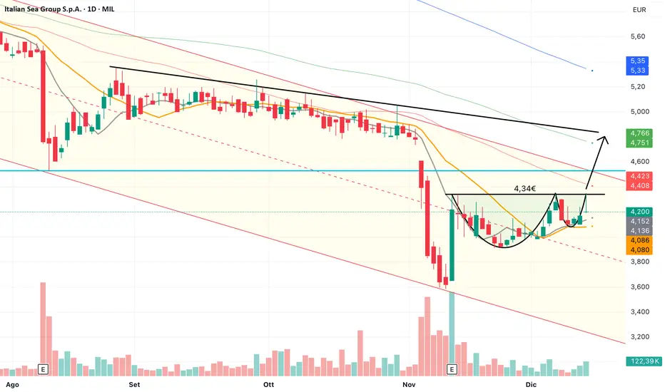 La settimana prossima una chiusura sopra i 4,34€ porterà successivamente il prezzo verso la resistenza nera rompendo il canale ribassista