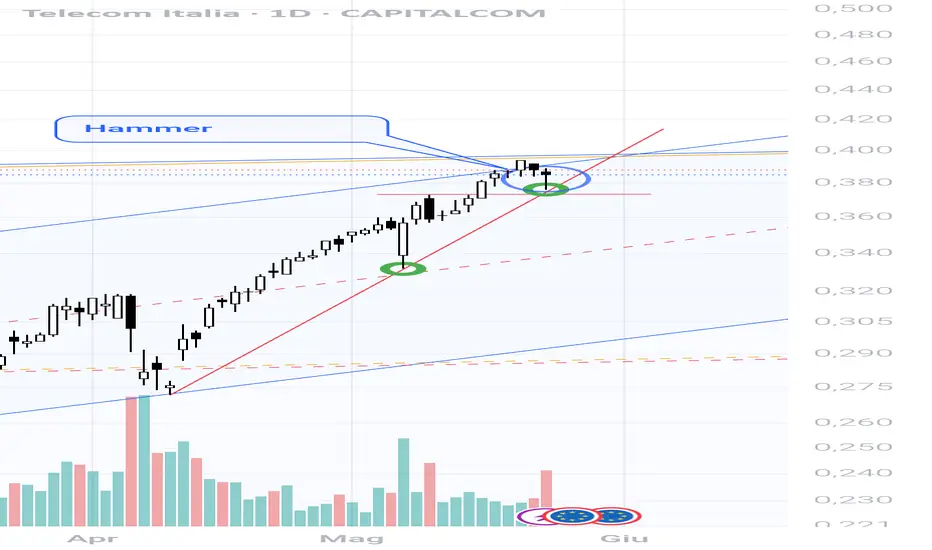 I prezzi hanno rimbalzato sulla trendline rialzista, hanno probabilmente anche fatto un pullback sul supporto statico a 0,37 chiudendo l'ultima giornata di contrattazione con una eloquente candela di hammer.