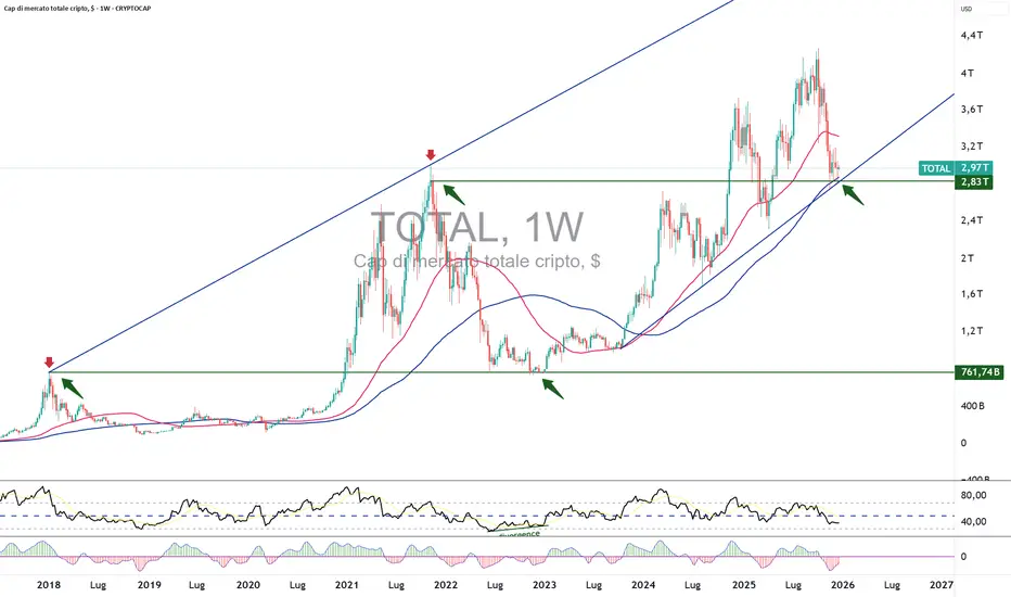 Il primo grafico riguarda la capitalizzazione totale del mercato crypto su base settimanale. Attualmente sta testando un supporto importante: il massimo del ciclo precedente stabilito nel novembre 2021. Questo livello svolge un ruolo tecnico centrale, poiché aveva segnato la fine dell’ultimo mercato rialzista. È ora rafforzato dalla media mobile a 100 settimane, che agisce come supporto dinamico di lungo periodo. Storicamente, questo tipo di confluenza tecnica ha spesso rappresentato una zona di stabilizzazione prima di un rimbalzo.