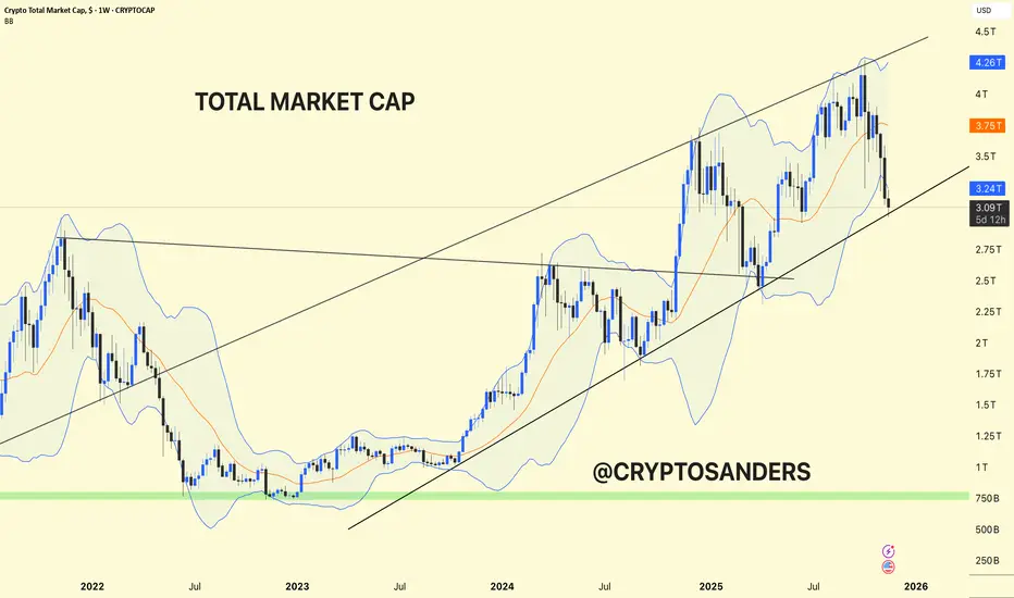The crypto market is at a critical inflection—channel support is being tested after a steep correction. Staying above $3T maintains the bullish structure. Watch for a decisive bounce or breakdown in the coming weeks.