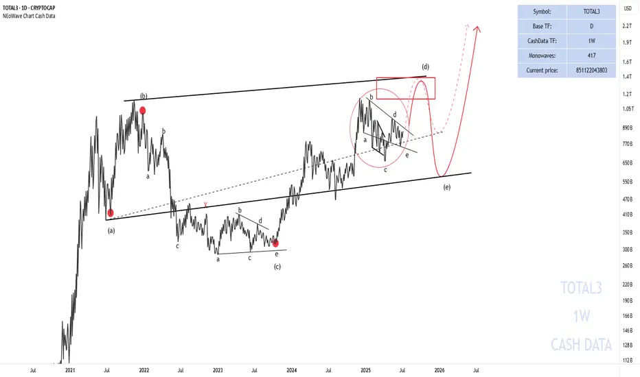 Total 3 seems to be forming a neutral triangle (marked with a red circle) and will soon move towards the red box to complete wave-(d) of the higher degree triangle.