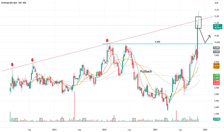 Il prezzo è stato respinto dalla resistenza rossa e ora molto probabilmente tornerà a testare il supporto in zona 9,9€
