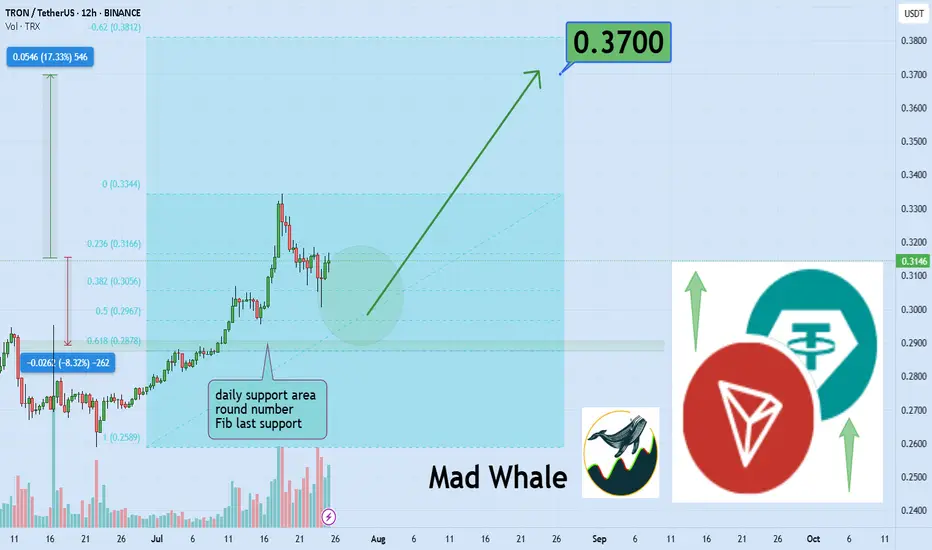 TRXUSDT is currently approaching a key daily support zone that aligns with a notable Fibonacci retracement level 🧭. This technical confluence suggests a potential short-term rebound, and I’m watching for a possible move of around 17% toward the 0.37 target 🎯.