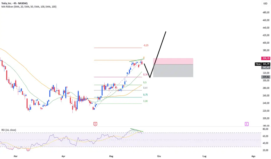 Target: zona 310 - 300 dollari (coincidente con il livello del ritracciamento di fibonacci 0,34)