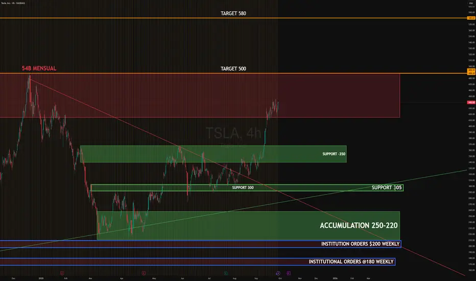 TSLA is consolidating below a major supply zone near 450, showing signs of distribution after the recent rally. Strong supports remain at 350 and 305, with a broader accumulation area between 250–220 tied to institutional orders. Price action suggests buyers remain in control unless 350 breaks.
