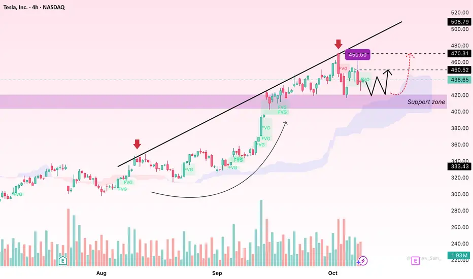 Overall, Tesla appears to be consolidating within a natural pause rather than reversing. As long as the $420 level holds, the bullish structure remains valid.