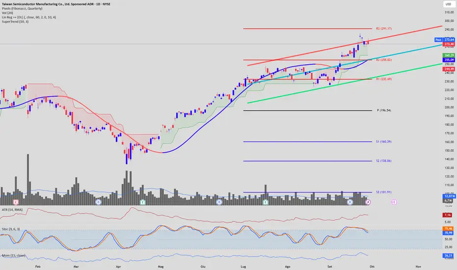 In sintesi, la struttura grafica di TSMC si conferma robusta e orientata al rialzo. L'approccio strategico privilegiato rimane quello di acquistare durante le fasi di debolezza controllata, con particolare attenzione ai supporti statici e dinamici identificati. La resistenza in area 291,17 rappresenta il target naturale del movimento in corso e un livello critico per la prosecuzione del trend rialzista.