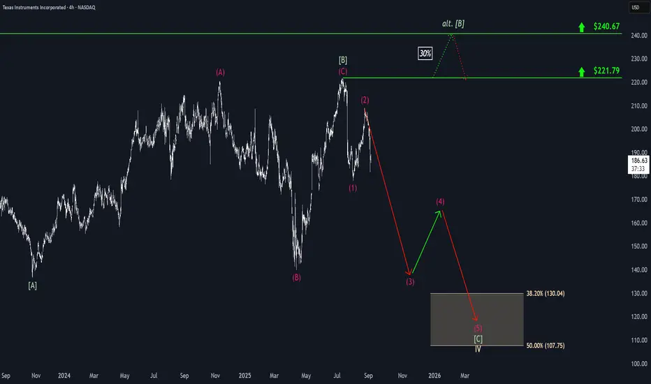 Texas Instruments has experienced sharp sell-offs, leading us to confirm the top of magenta wave (2). This suggests that the stock has completed the second stage of the ongoing magenta downward impulse. The current wave (3) still presents significant downside potential in the near term. After a brief recovery in wave (4), wave (5) is expected to reach our beige Target Zone between $130.04 and $107.75. A new corrective high in green wave alt.[B] above $221.79 could delay this process. However, in this 30% likely scenario, TXN should reverse course at the latest by the $240.67 level.