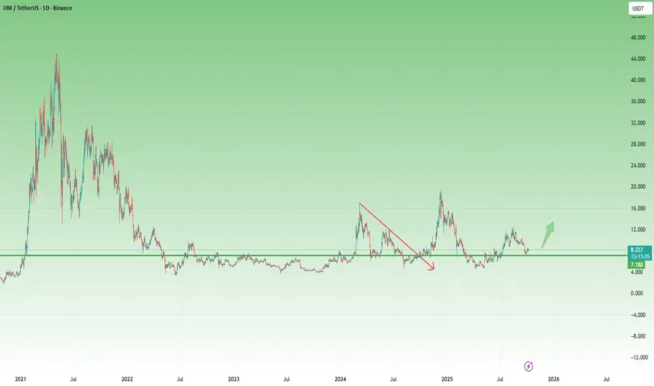 After the massive 90% drop from its 2021 peak, Uniswap has been consolidating within a wide range. Each attempt to break higher has so far been followed by a return toward the lower end of the structure — a clear sign of prolonged accumulation.