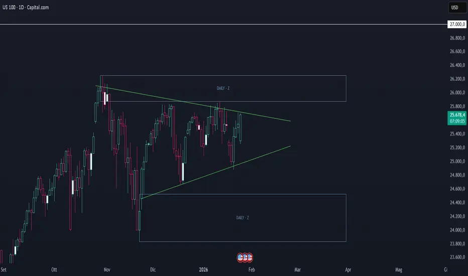 Seguendo l'orderflow rialzista, andremo a prendere (con tutte le conferme neccessarie) un long con obiettivo principale il massimo della zona sopra (che coincide anche con il massimo storico) a 26.255.