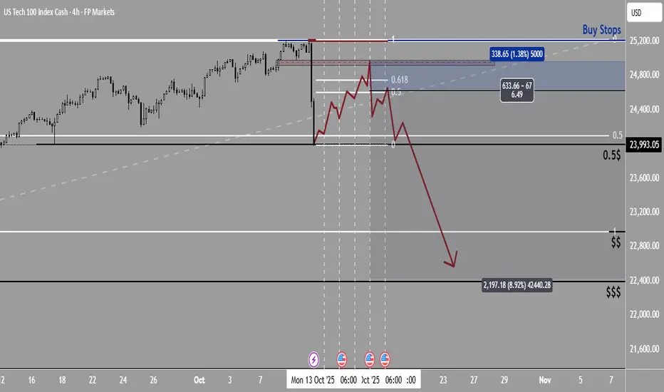 Scenario 2: NASDAQ might retest the previous high — the one where the sharp drop started — move sideways for a while, and then start another leg down.