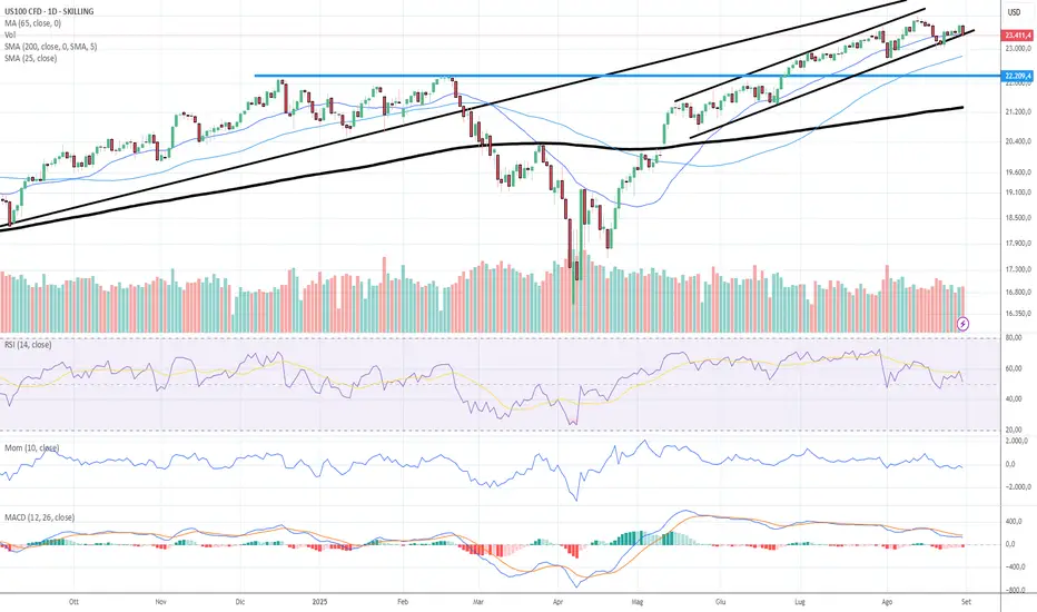 Sempre meno spinta rialzista, nessun nuovo massimo, sta sul lato inferiore del canale e divergenze ribassiste sempre piu evidenti. Stagionalmente settembre ed una parte di ottobre sono mesi deboli. Elevata leva finanziaria potrebbe portare a bruschi movimenti ribassisti.