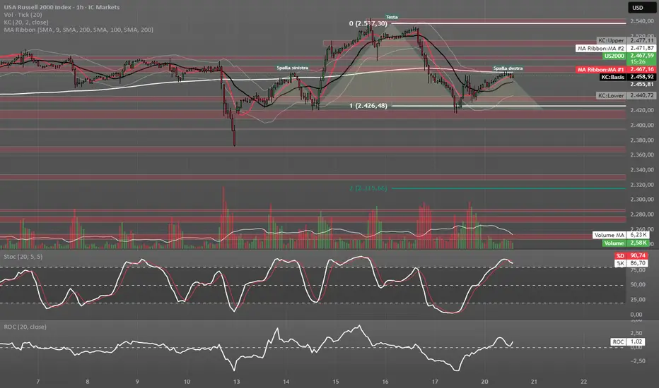 Si fornisce analisi sul grafico orario di un CFD sul future del Russell 2000. Ho evidenziato la possibile figura di Testa & Spalle in formazione (ci troveremmo sulla punta della spalla destra), evidenziando il teorico target utilizzando la proiezione dell'altezza della figura. Gli scarsi volumi sulla salita della spalla destra deporrebbero a favore di questa teoria.