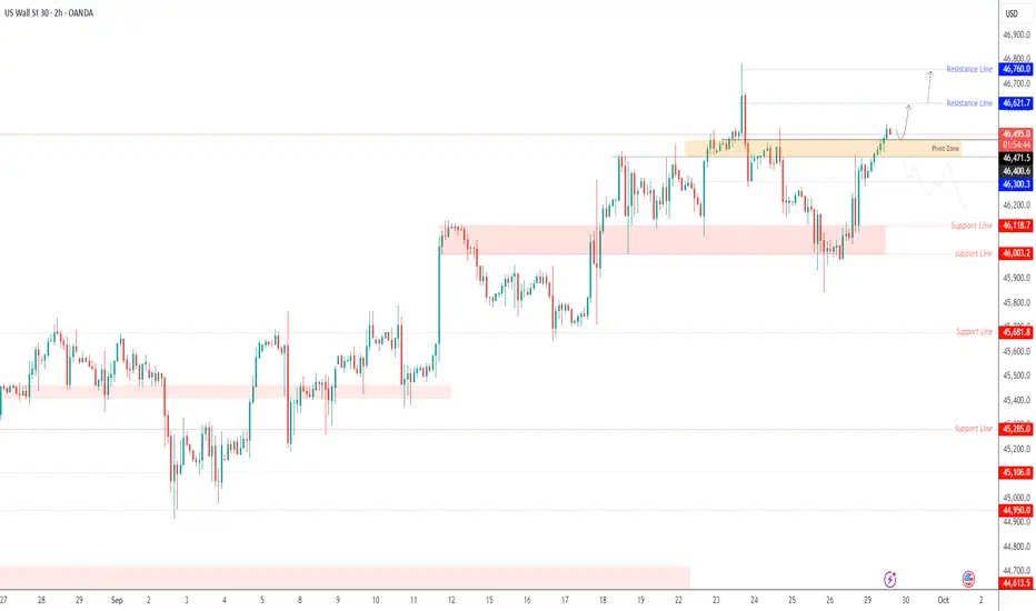 Technically, US30 maintains bullish momentum after stabilizing above the 46,470 pivot zone.