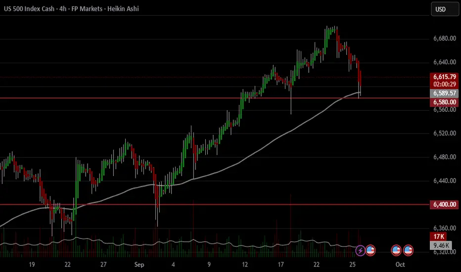 The S&P 500 is at a key moment right now, testing the 6580 support area after a sharp pullback from recent highs.