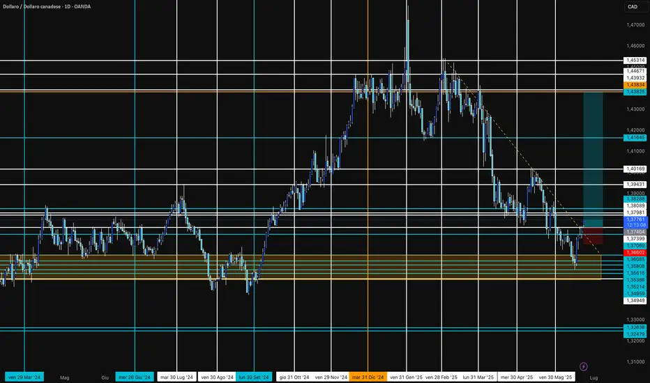 Fase accumulativa: Confermo che l’area tra 1,3580 e 1,3660 ha funzionato come supporto forte (zone dorate), con diverse candele di rifiuto verso il basso.