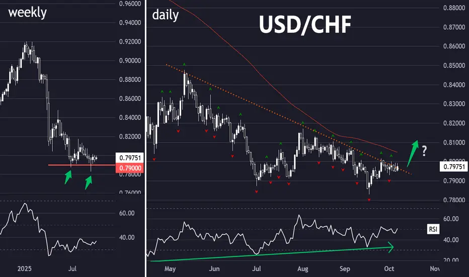 Setup: Possible bottom. Two failed breaks below 0.79 + RSI bullish divergence.