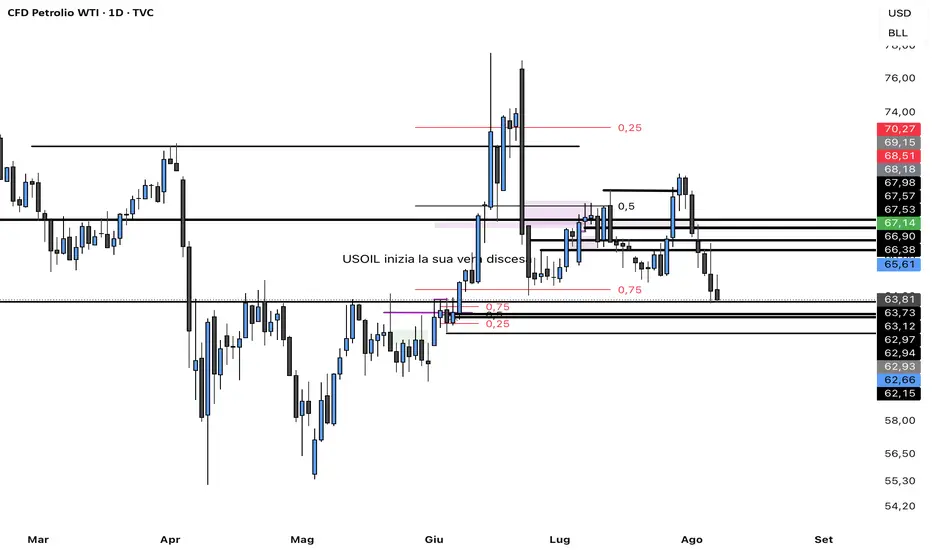 Il prezzo dell'USOIL inizia finalmente la sua vera discesa dopo l’ultimo ritest e sweep dei massimi, segnando un cambiamento di direzione; dovrebbe mantenere una tendenza ribassista.