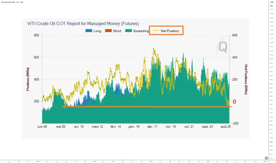 Secondo i dati del COT report della CFTC, i gestori istituzionali hanno ridotto le posizioni long e aumentato le posizioni short sui future del petrolio. Il grafico mostra una tendenza ribassista della posizione netta istituzionale, coerente con la pressione sui prezzi degli ultimi mesi. Tuttavia, la posizione netta si trova ora in una zona storicamente bassa, intorno allo zero, livello che nel 2008 segnò l’inizio di un forte rimbalzo. Resta comunque valido che, finché la resistenza dei 65 dollari non verrà superata, la tendenza di fondo del petrolio rimarrà ribassista.