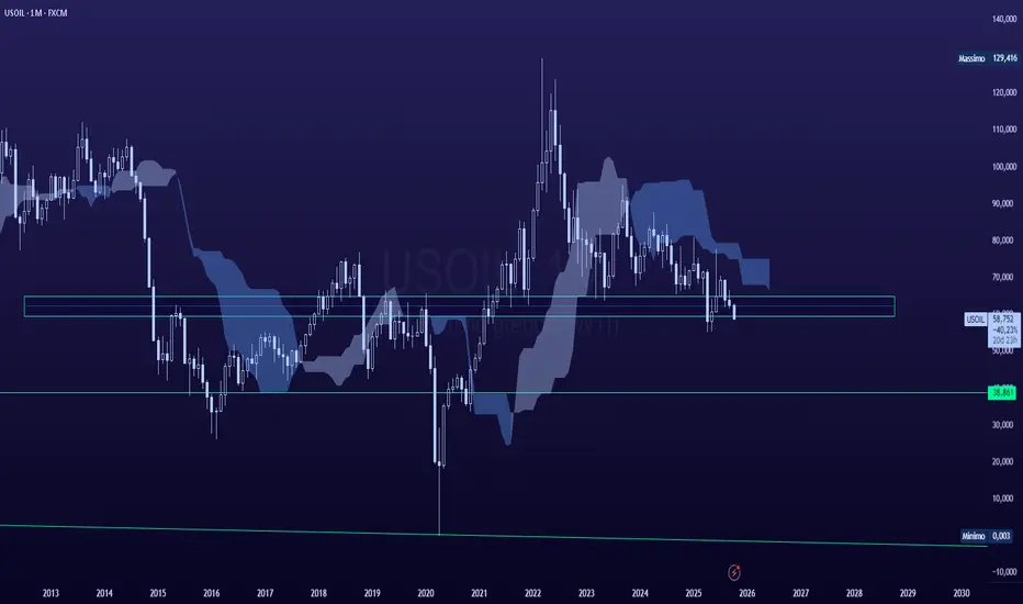 Sul grafico mensile del WTI (USOIL) il mercato sta affrontando un momento di forte equilibrio tecnico. L’area tra 58 e 60 $ è il vero cuore strutturale di questa fase: non solo un livello di prezzo, ma una zona di memoria storica, dove più volte domanda e offerta si sono bilanciate nel passato. È qui che, dopo il collasso del 2020, prese forma la base del grande trend post-Covid, e ora, con una nuova pressione ribassista, il mercato sta testando la solidità di quella struttura.