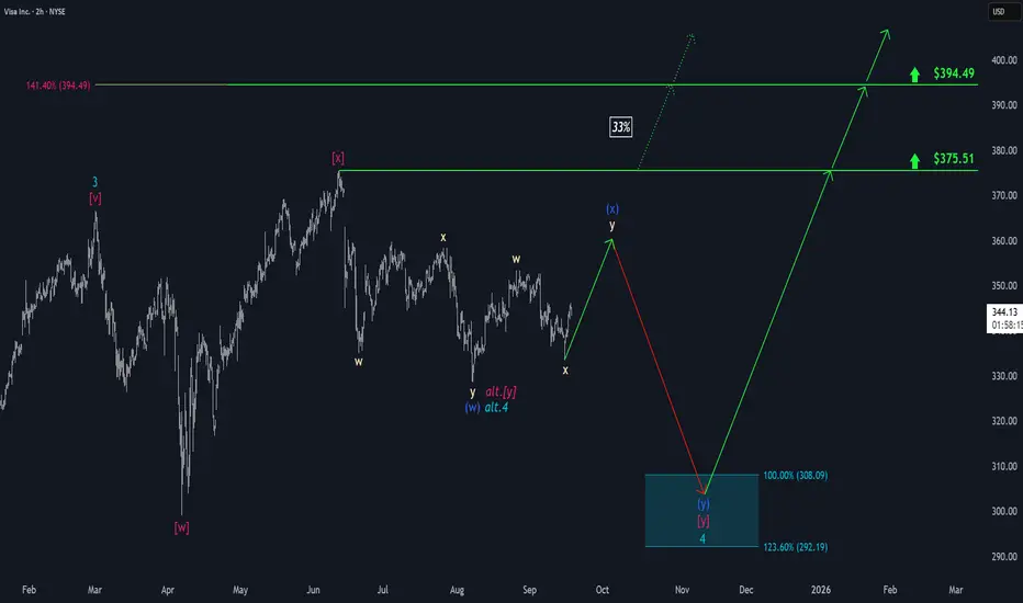 In our primary scenario, we place Visa in the corrective upward move of blue wave (x). After the top, we expect the broader downward trend of turquoise wave 4 to take hold, which should push the stock into our turquoise Target Zone between $308.09 and $292.19. At that level, we anticipate a sustained reversal. From this low, a new upward impulse is likely: wave 5 should then have enough strength to lift price above the resistance levels at $375.51 and $394.49. However, an alternative scenario remains relevant: there is a 33% probability that the correction of wave alt.4 has already concluded. If so, the stock could immediately break above the resistance levels mentioned.
