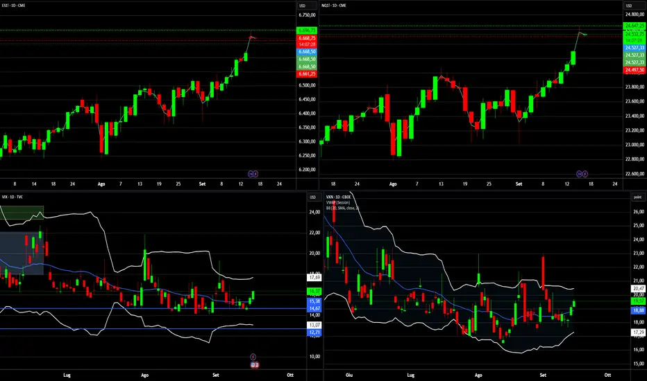 Buongiorno a tutti i traders, analizziamo l'andamento dell'indice della volatilità degli indici più importanti che sale mentre sale anche l'indice. La situazione è incongruente e merita attenzione. Un aumento del VIX (e del VXN) mentre gli indici S&P 500 e Nasdaq raggiungono nuovi massimi storici è anomalo. Normalmente, c'è una correlazione inversa tra gli indici azionari e i rispettivi indici di volatilità. Quando gli indici salgono (mercato "tranquillo" e ottimista), la volatilità implicita tende a scendere. Viceversa, in fasi di ribasso o incertezza, il VIX e il VXN schizzano.