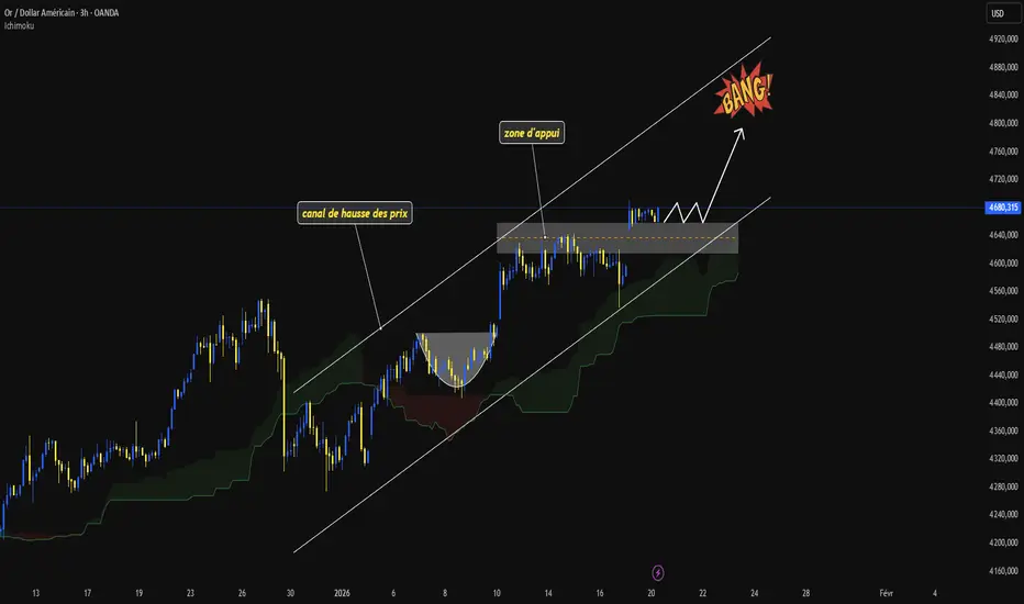Tant que le prix reste au-dessus de la zone de support, la probabilité favorise une poursuite de la hausse vers le canal supérieur, avec une dynamique se construisant pour la prochaine hausse impulsive.