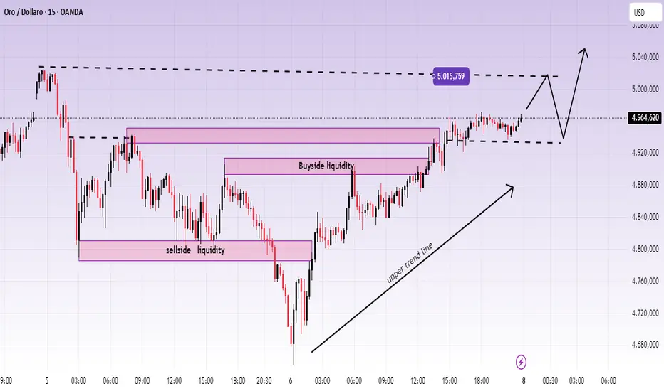Continuazione bullish: Mantenere sopra 4,940–4,970 → riprendere i massimi → cercare liquidità verso 5,015, poi estensione più in alto se il prezzo accetta.