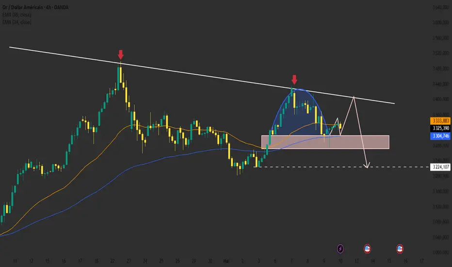 Le prix de l’or montre des signes d’essoufflement après avoir rebondi depuis la zone de support autour de 3.300, mais il n’a toujours pas réussi à franchir la trendline baissière de long terme. Le scénario semble se répéter : le prix approche la trendline, est rejeté, puis repart à la baisse.