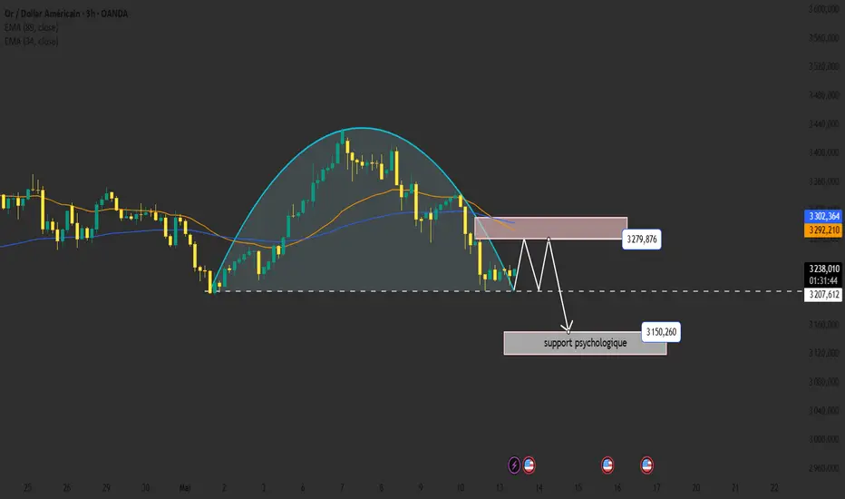 XAUUSD forme un motif clair de « sommet arrondi » sur le graphique 3H, suggérant un risque accru de retournement baissier. La zone des 3.279 constitue actuellement une résistance à court terme – si le prix est rejeté à ce niveau, il pourrait rapidement plonger vers le support psychologique des 3.150, comme illustré sur le graphique.