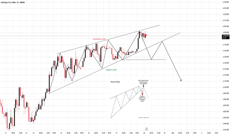 The market is currently respecting the structure of a Rising Wedge — a pattern where price continues rising but momentum weakens, volatility compresses, and the probability of a bearish breakdown increases.