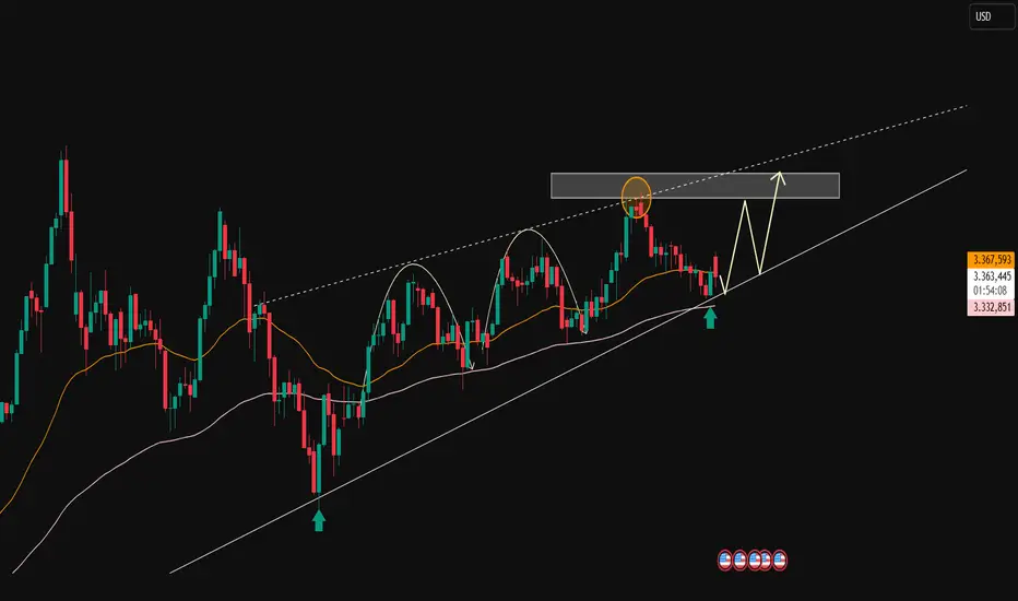 Altın, uzun vadeli yükseliş trendini sağlam bir teknik yapıyla sürdürüyor. Grafikte, fiyat şu anda 3.345 USD civarındaki dinamik destek bölgesini test ediyor – bu seviye yükselen trend çizgisiyle ve EMA89 ile trùng khớp, geçmişte defalarca güçlü bật lên đã xảy ra.