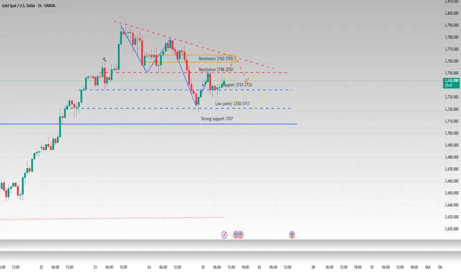 Yesterday's daily gold price closed in the red, with the MA5 moving average near 3735. If today's daily closing price falls below the MA5 and reaches the MA10, bears will regain control of the market. Looking at the 4-hour Bollinger Bands, after breaking below the middle line, the price has fluctuated, briefly stabilizing near 3735. Currently, it is consolidating sideways, but if the European/US session breaks below 3735-3720, further declines to 3710-3700 are possible. The short-term downward trend is still under pressure and the market is in a weak state. Therefore, intraday gold trading is still mainly short selling, with long buying as an auxiliary.