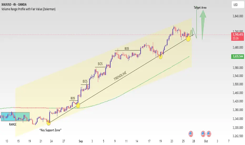 On the XAUUSD chart, price has been moving inside a downward channel while consistently forming Break of Structure (BOS) points. Recently, the market has reached the lower trendline support where buyers are starting to step in.