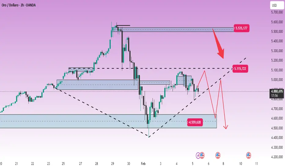 L’oro rimane sotto pressione sul timeframe H2 poiché un dollaro USA più forte continua a pesare sui metalli preziosi. Il recente rimbalzo è di natura correttiva e non mostra accettazione sopra le principali aree di offerta. Con il mercato concentrato sui dati NFP USA rinviati all’11 febbraio, la volatilità è probabile, ma la struttura favorisce ancora la vendita sui rialzi piuttosto che l’inseguimento del prezzo.