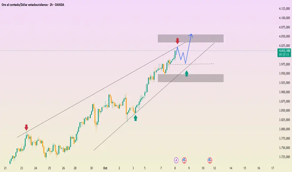 En el gráfico de 2H, el precio se mueve dentro de un canal ascendente. La zona de soporte clave se encuentra alrededor de 3,970, mientras que la resistencia más cercana apunta a 4,050. Cada retroceso hacia la línea de tendencia o la zona de demanda representa una buena oportunidad para acumular compras.