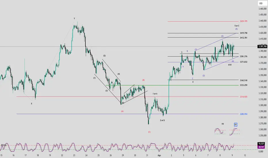 → Lunedì potremmo vedere un ultimo impulso rialzista per completare la onda 5 blu. Questo rappresenterebbe un’opportunità per cercare vendite (SELL) nella zona target 3412–3419.