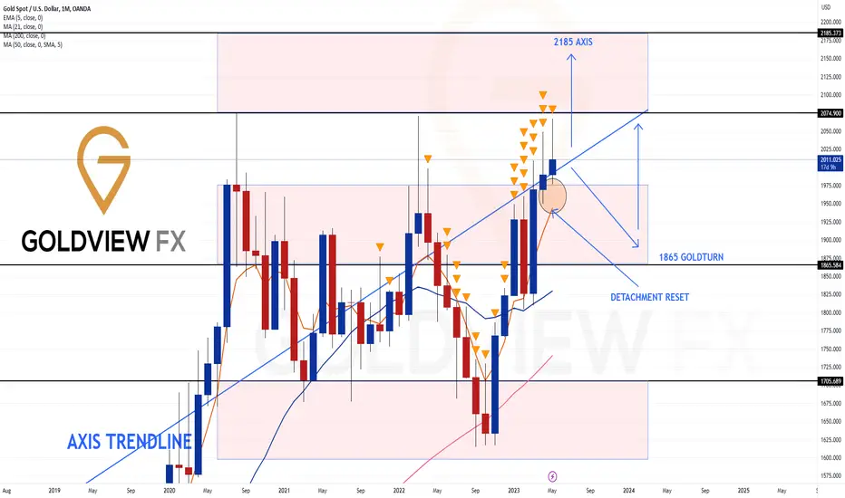 Price is currently at a crucial part of the range testing and playing on the axis trendline. We will need to see price close above the axis trendline this month to open the range above. Ema5 cross above the axis trendline will further support the movement. If we see price and EMA5 play under the AXIS trendline then we can expect price to test 1865 Goldturn for a retest and to establish support for a bounce.