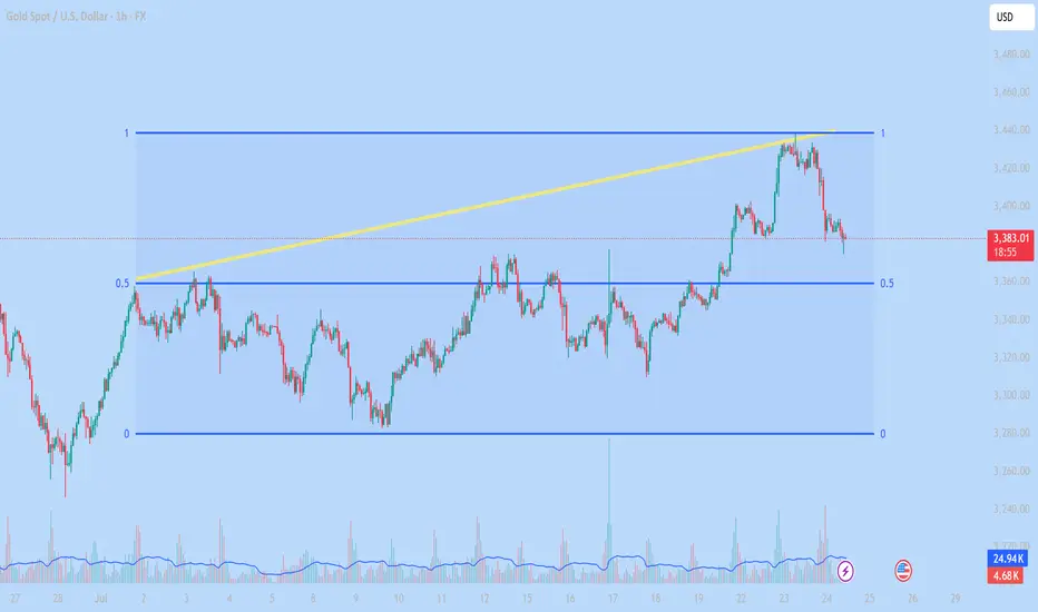 The 0.5 Fibonacci level (around $3,360) is acting as a major support zone and price is currently testing this level.